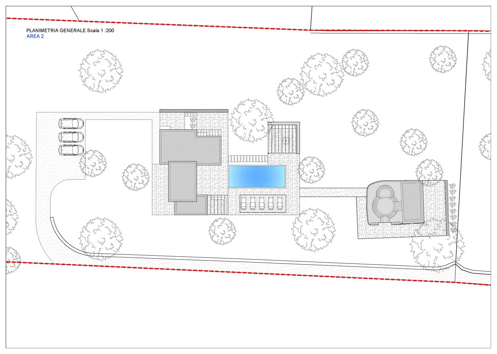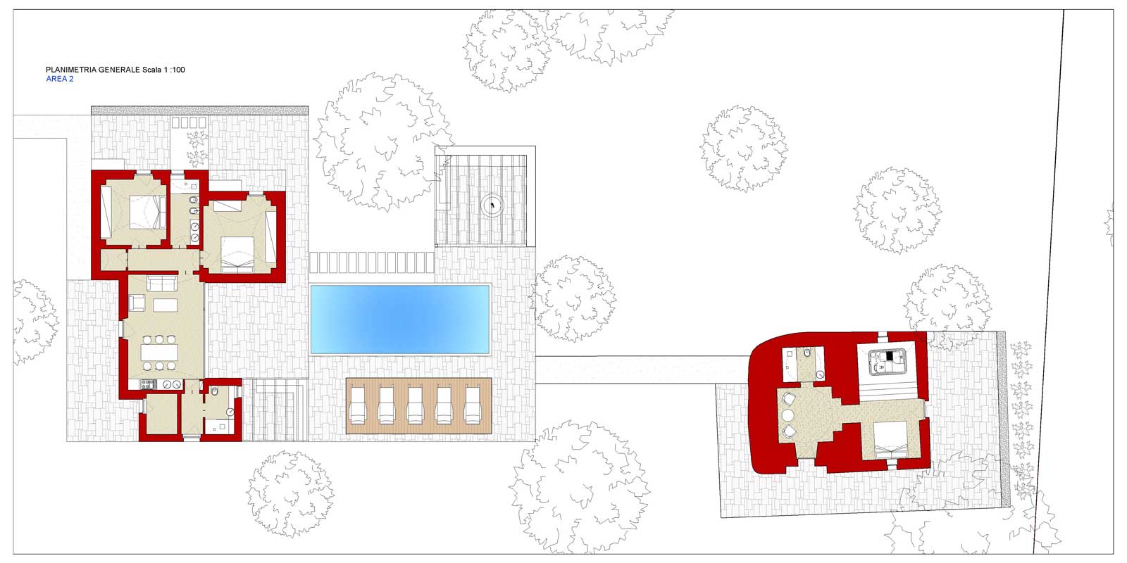 • Aree esterne: pergolato, angolo barbecue.